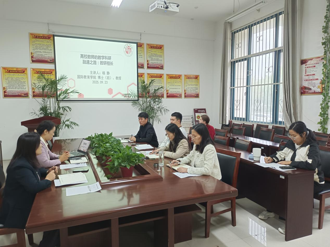 报告主要分为三个部分,一是对高校教师教学科研现状的分析,并从“五术”“四度”的融合界定优秀教师所应具备的能力和素养;二是以她主持的河南省首批线下一流本科课程《汉英笔译》为例,分享了如何在课程建设和教学设计中将教学科研打通,以教学科研“互哺”的丰富案例,生动阐释了课程思政润物无声融入课堂教学的策略和方法。三是结合大量的教学大赛实战经验,以校长教学杰出贡献奖中的参赛课题“译者的素养”为例,为大家做示范课,鼓励青年教师“以赛促教、以赛促研、教研相长”。讲座最后,大家进行了分享发言和深入研讨。