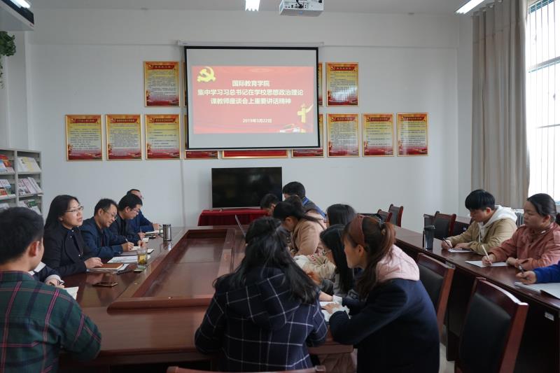 3月22日下午,William威廉英国在党建活动室举行学习习近平总书记在学校思想政治理论课教师座谈会上重要讲话精神会议。院党总支书记李秀琴,院长任付标,副书记宁智锋,副院长王军强,曹庆艳,各位辅导员老师以及学生党员代表参加会议。会议由李秀琴主持。