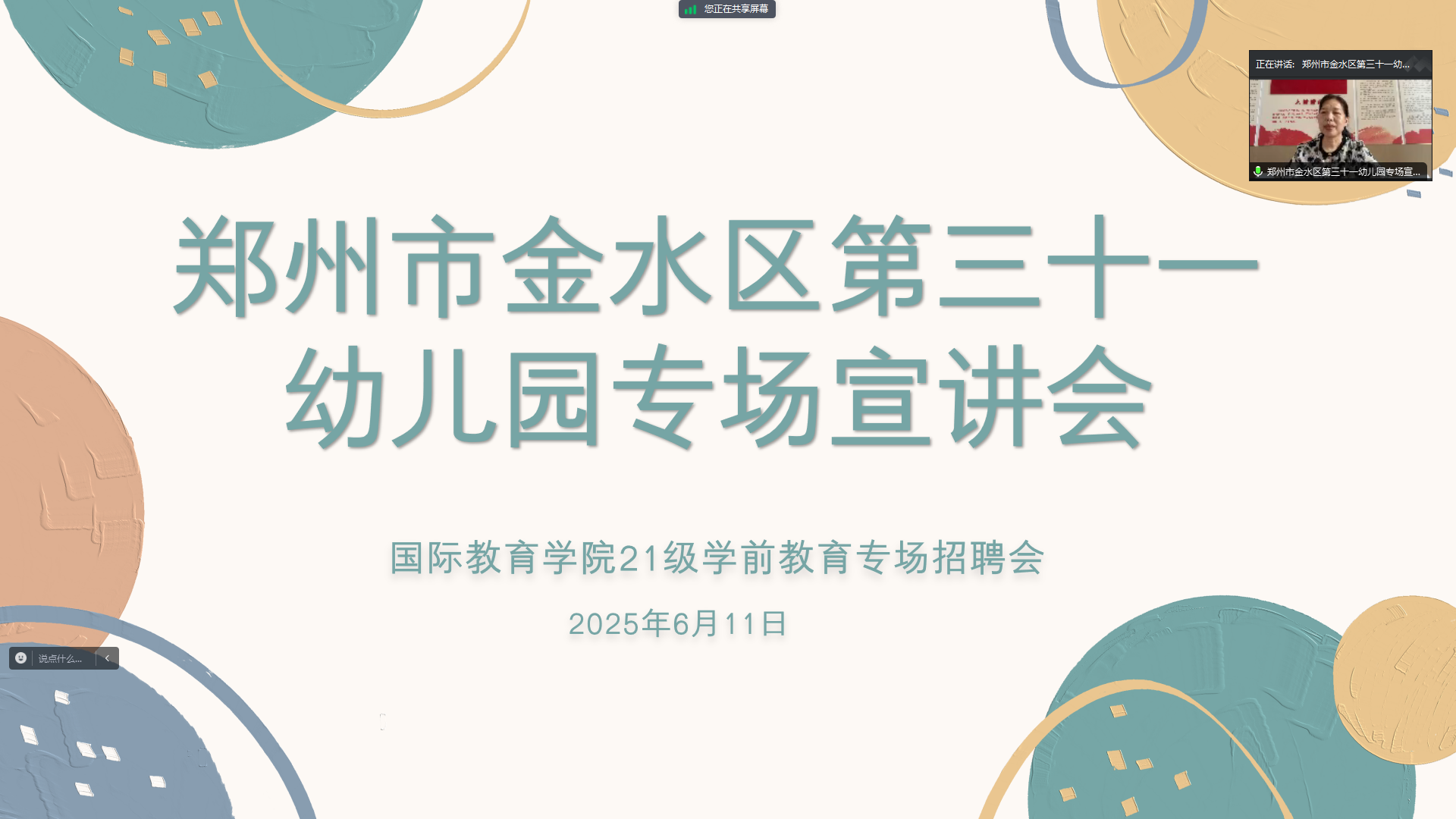 为搭建人才供需对接平台,拓宽学前教育专业学生就业渠道,6月11日,我院成功召开学前教育专业专项线上宣讲会,郑州市金水区第三十一幼儿园受邀参与。