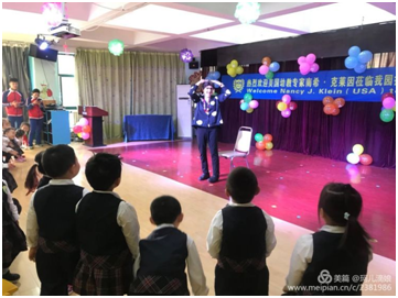 幼儿园热情的师生、现代化的设施、整洁的环境给Nancy留下了深刻的印象。在观看了音乐和足球公开课后,她对教师们的表现赞不绝口,并主动为孩子们上了一节英语歌曲课。