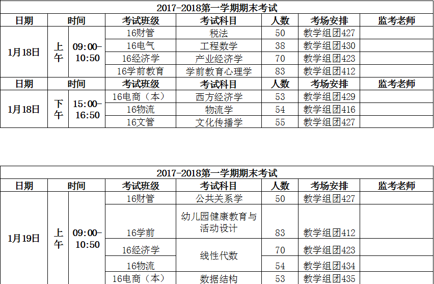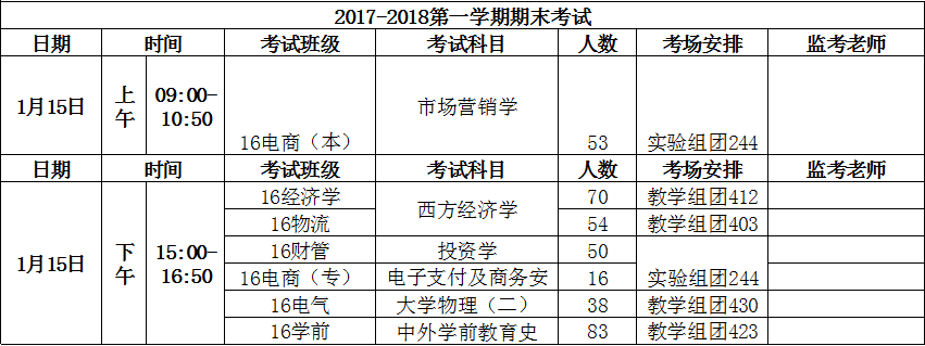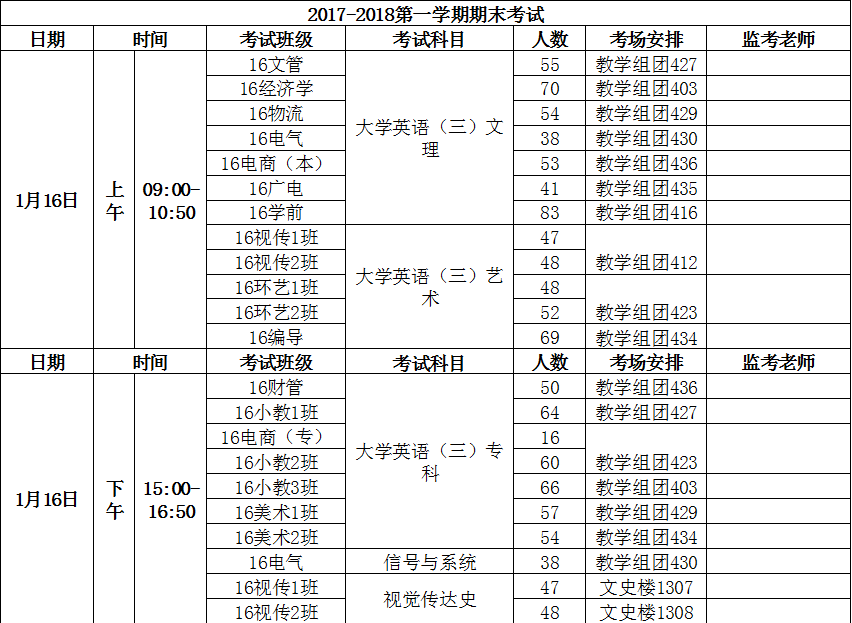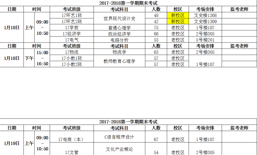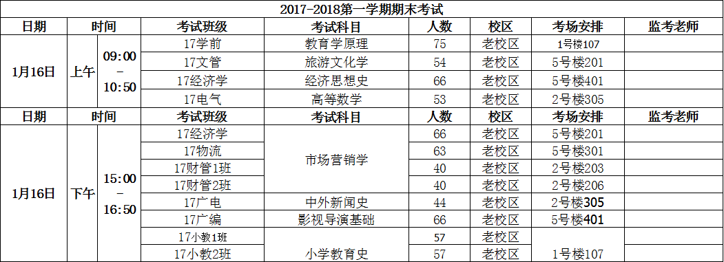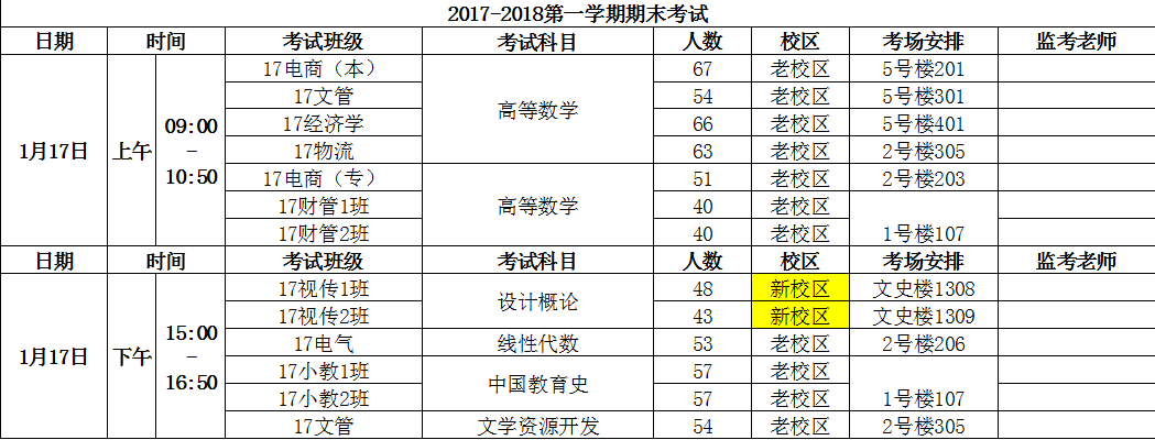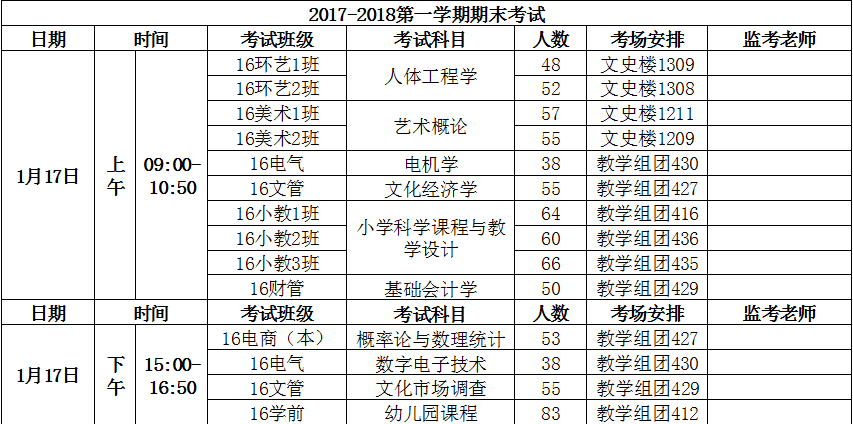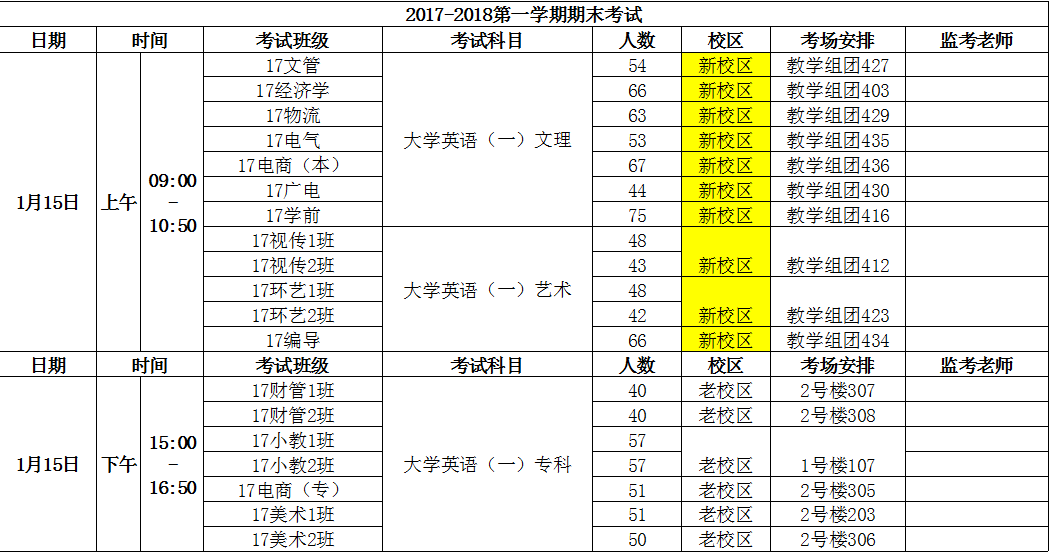 2017-2018第一学期期末考试 William威廉英国期末考试安排表