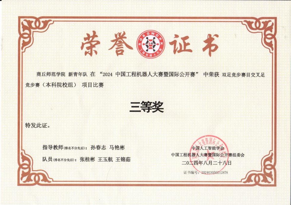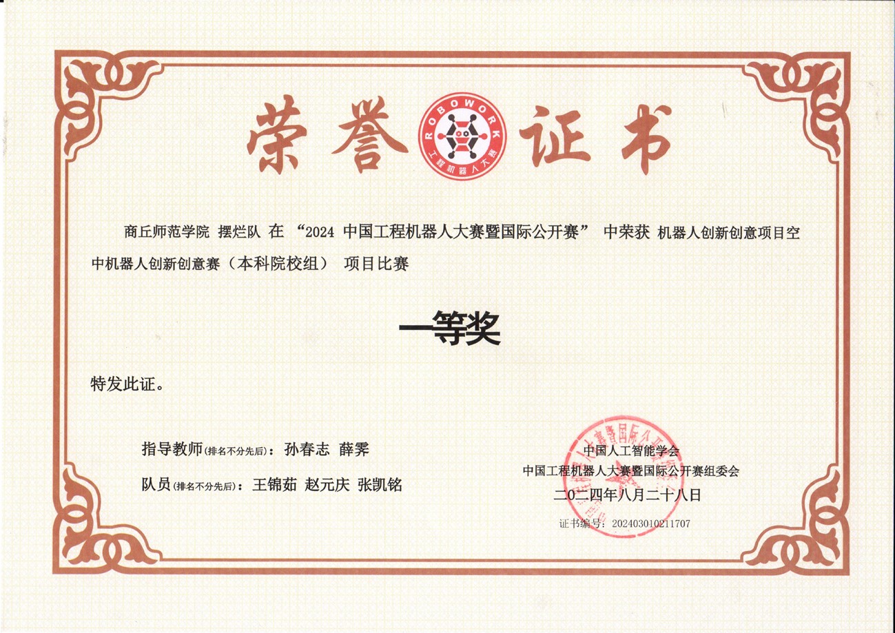 2024年8月,在中国创造协会、西安城市发展集团主办,中国人工智能学会认知系统与信息处理专业委员会等单位主办的中国工程机器人大赛暨国际公开赛中,我院同学积极备赛和参赛,最终获得全国一等奖和三等奖的优异成绩。