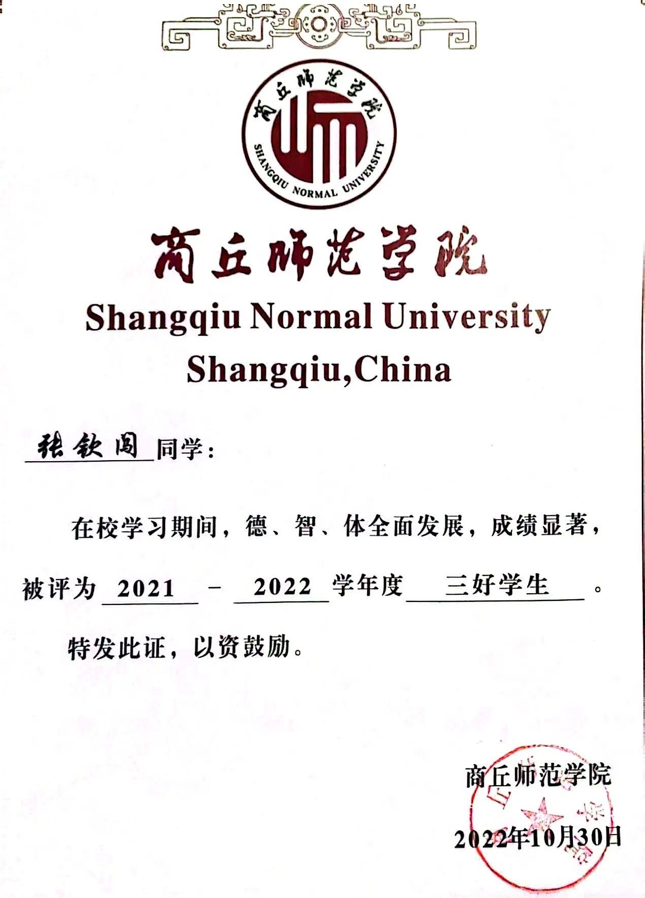 个人荣誉证书: